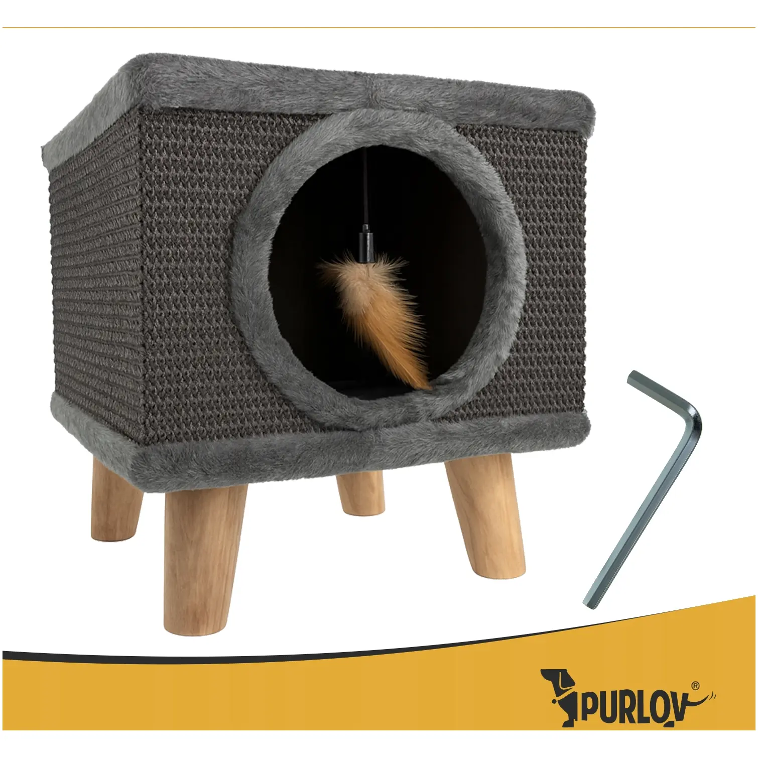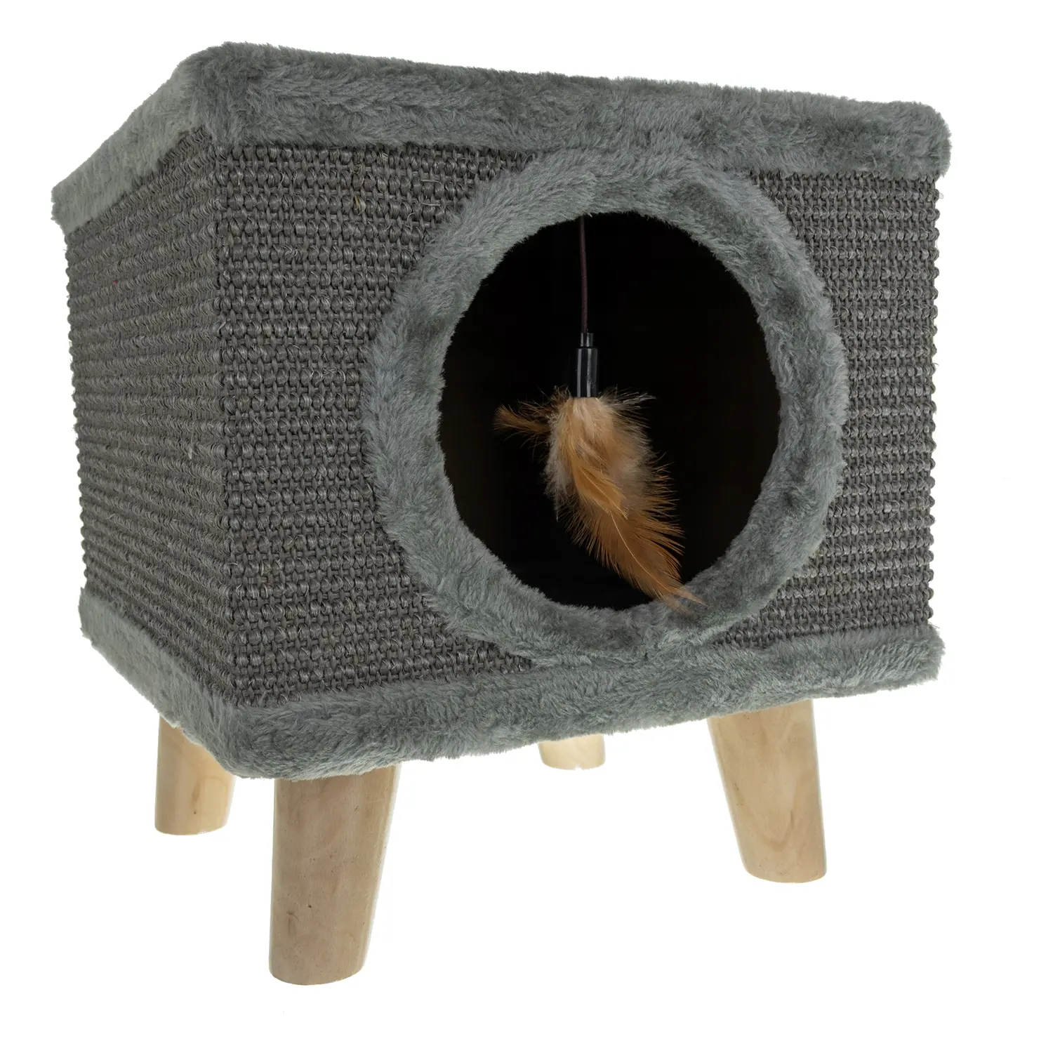 ✅ Konstrukcja domku oparta jest na solidnych, drewnianych nogach, co gwarantuje stabilność nawet podczas intensywnej zabawy. Twój kot może skakać, wspinać się i drapać, a mebel pozostanie na swoim miejscu. Dodatkowe antypoślizgowe zaślepki na nogi chronią podłogę i zapobiegają przesuwaniu się domku – to pewność, że Twój pupil bawi się bezpiecznie, a Ty masz spokój.